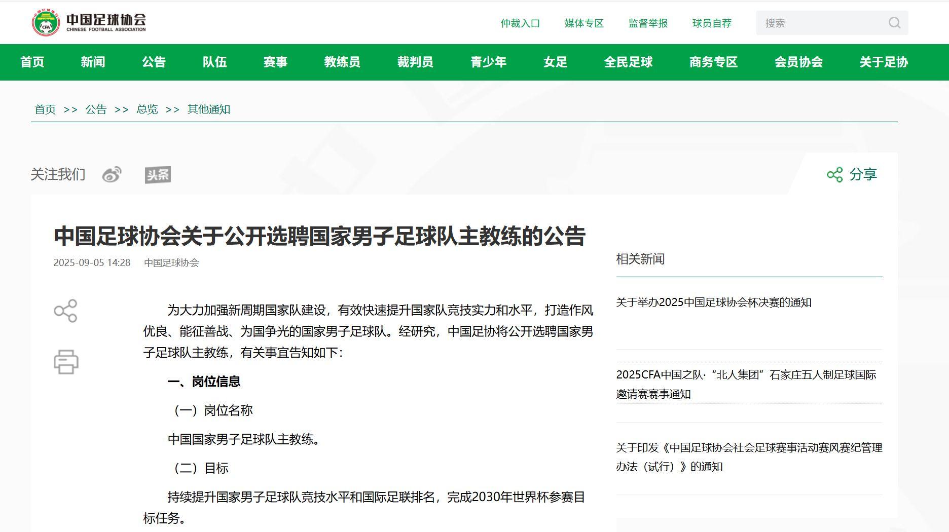9月5日,中国足球协会发布关于公开选聘国家男子足球队主教练的公告。