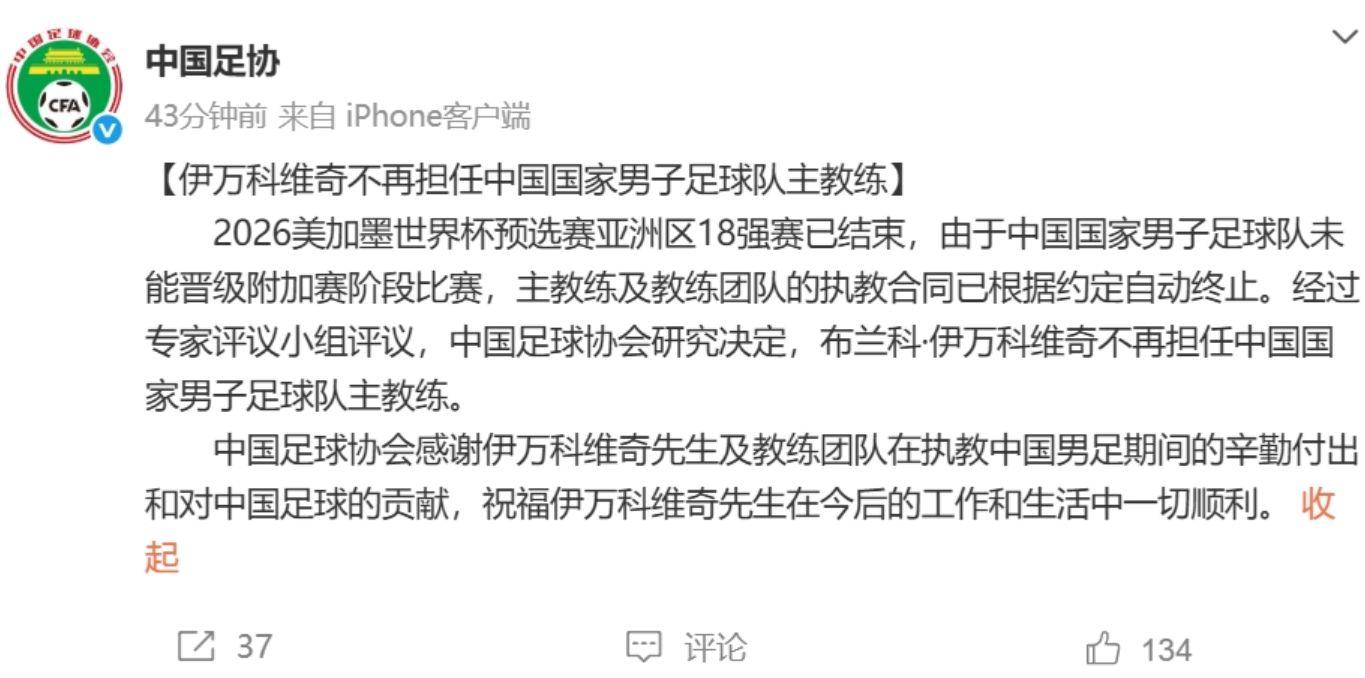 中国足球协会感谢伊万科维奇先生及教练团队在执教中国男足期间的辛勤付出和对中国足球的贡献,祝福伊万科维奇先生在今后的工作和生活中一切顺利。