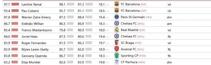 直播吧09月04日讯 著名足球数据统计机构cies,评选了2025年世界最强的200个U20球员,其中有3名中国球员入围。这3名入围的中国球员是王钰栋(54)、李新翔(158)、杨皓宇(199)。世界前10↓1.亚马尔2.库巴西3.扎伊尔-埃梅里4.埃斯特旺5.马斯坦托诺6.哈托7.罗杰-...